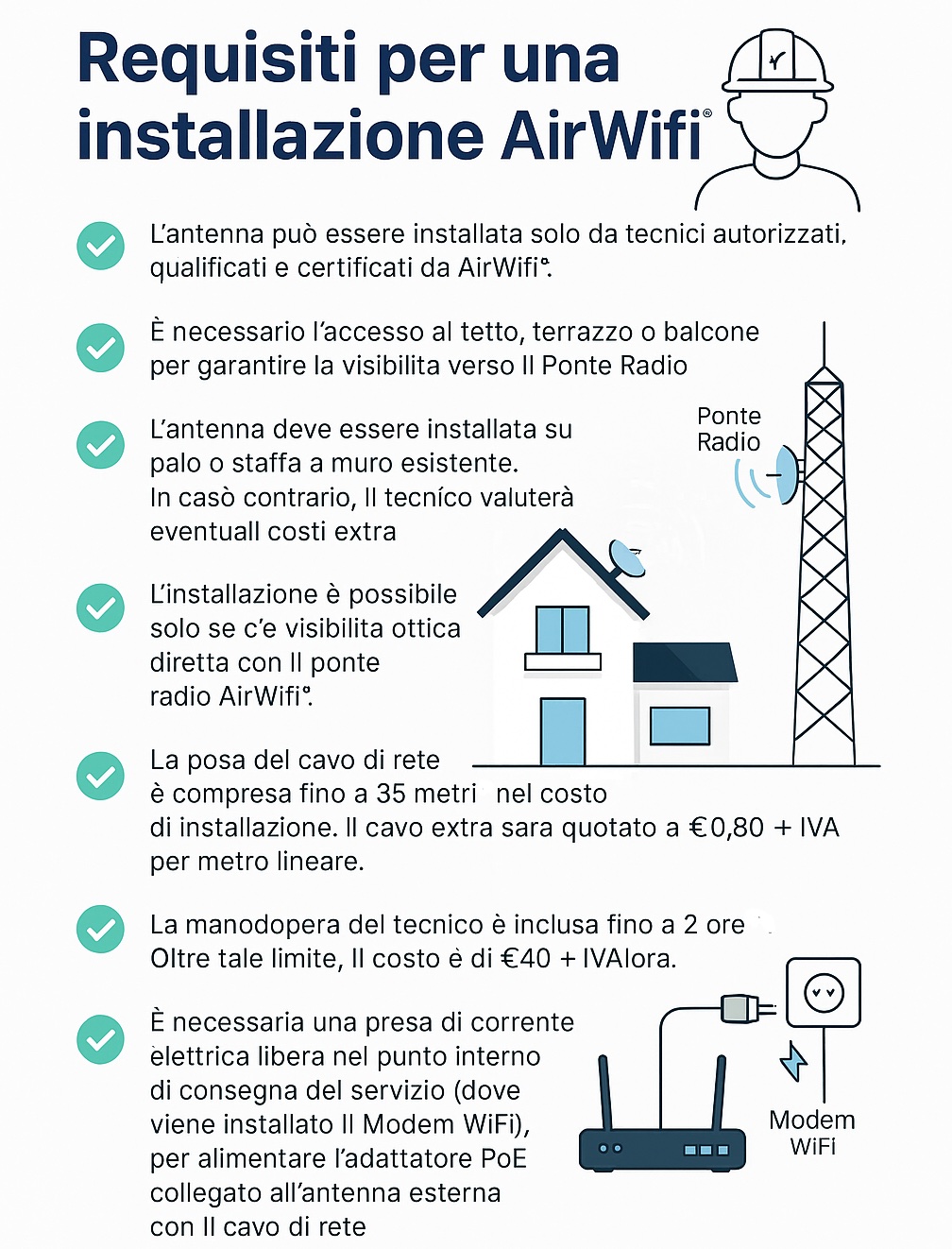 **AirWifi® include fino a 2 ore di manodopera del tecnico per l'installazione dell'impianto e il suo collaudo. Per esperienza sappiamo che 2 ore sono sufficienti per il 99% dei casi.